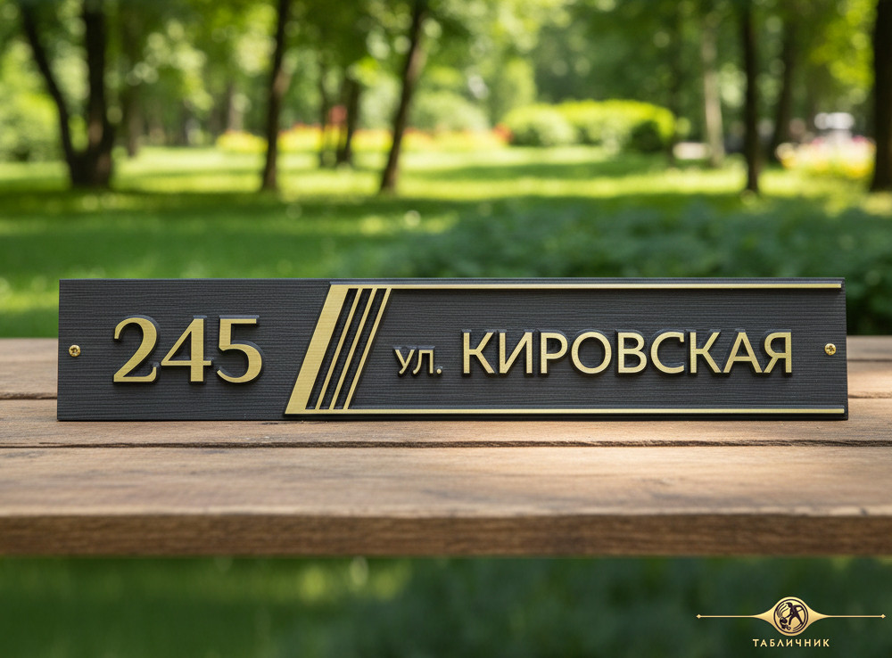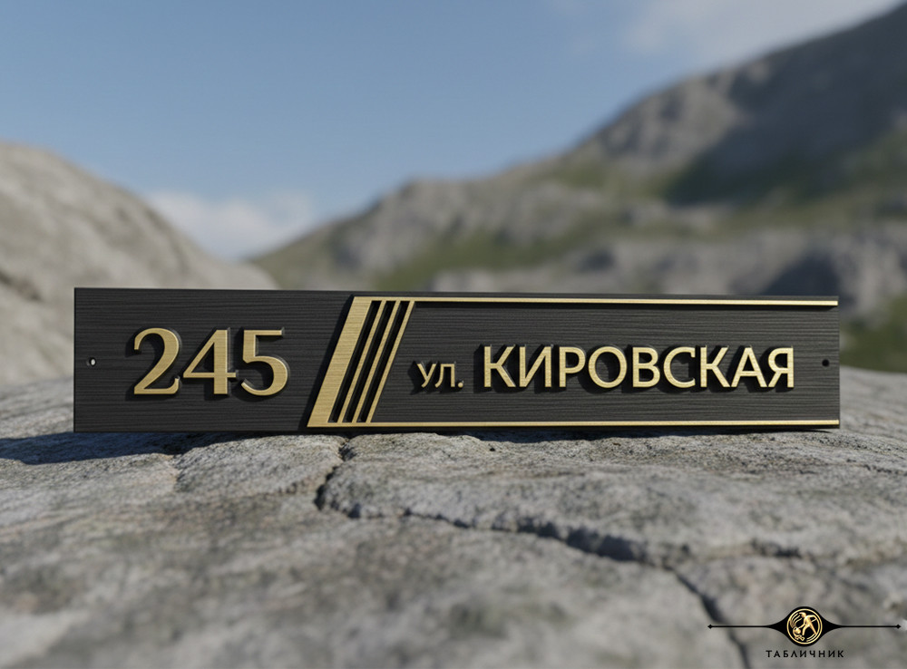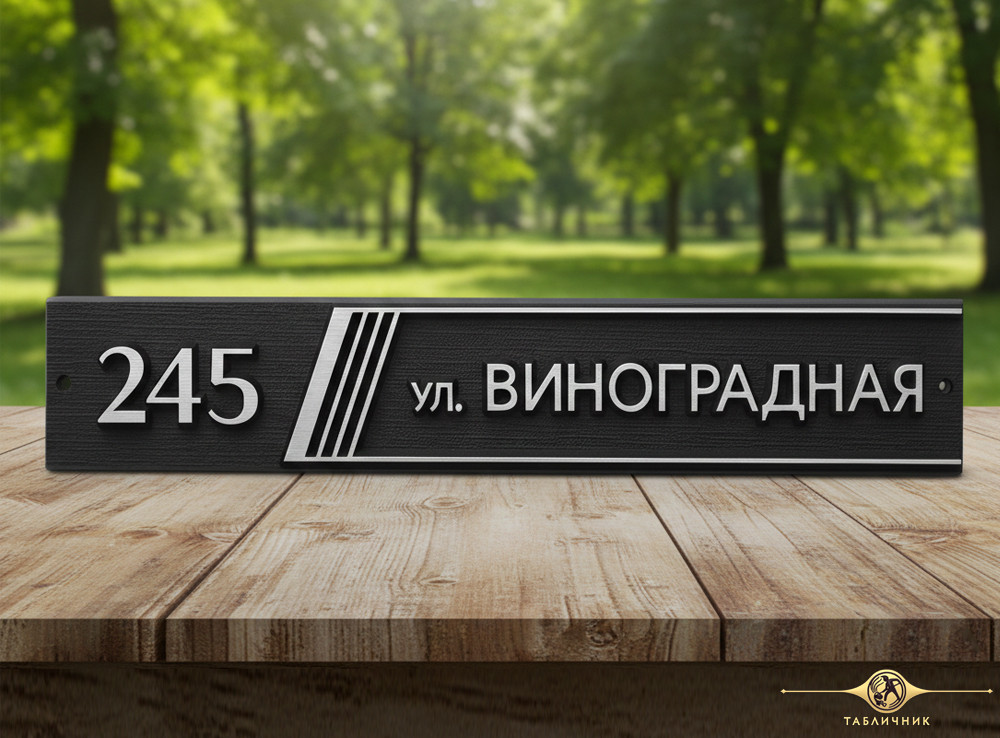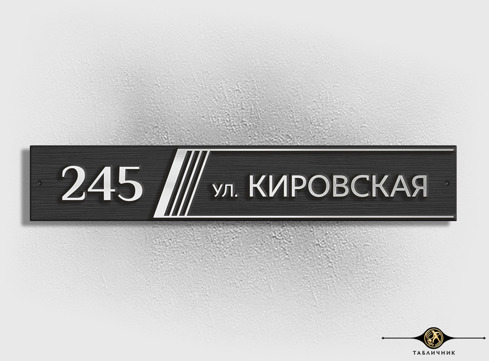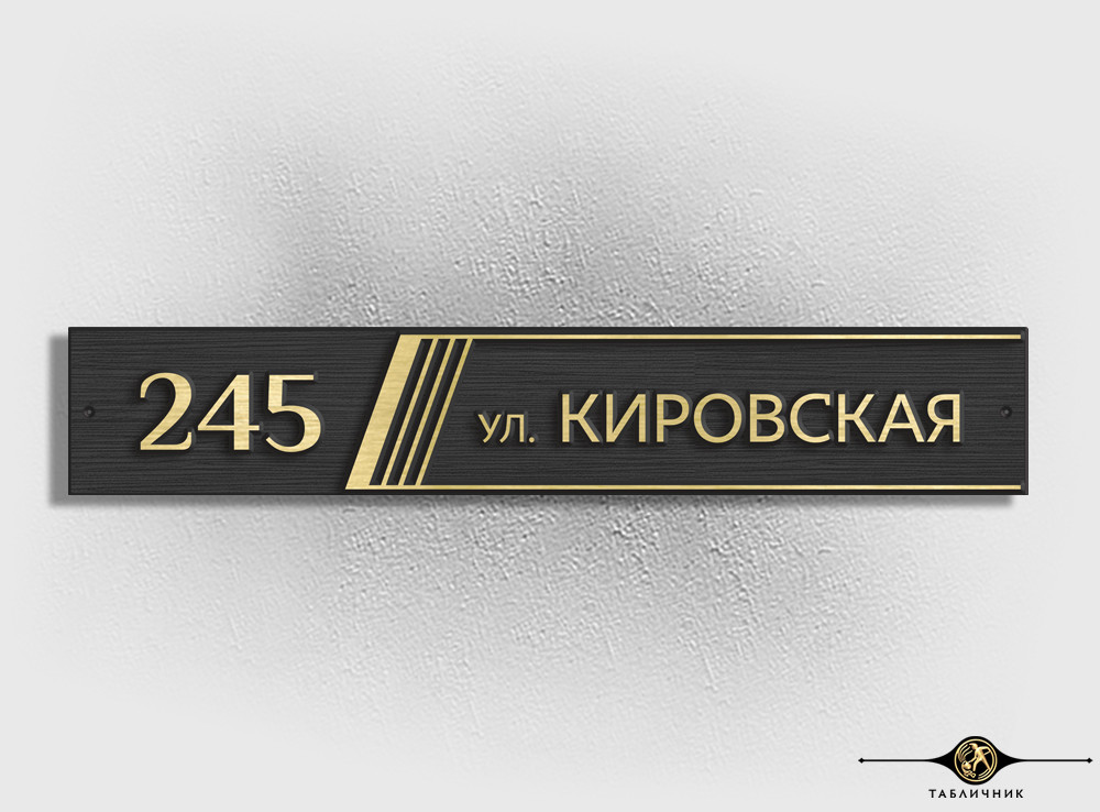 Адрес вписан в вытянутый прямоугольник, украшенный лишь серией косых полосок. Декоративный элемент добавляет динамики и визуально структурирует информацию, отделяя номер дома от названия улицы.