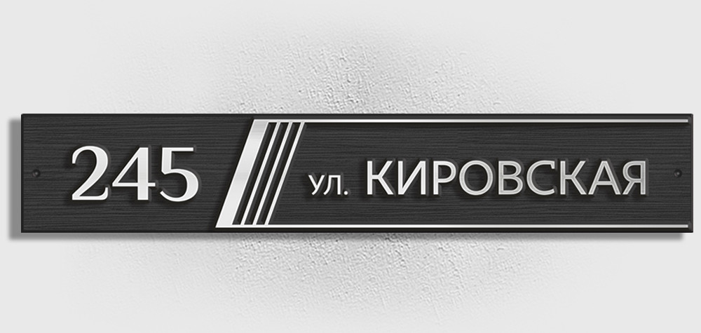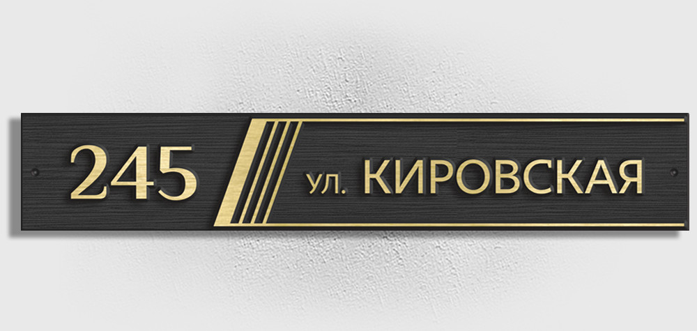 Адрес вписан в вытянутый прямоугольник, украшенный лишь серией косых полосок. Декоративный элемент добавляет динамики и визуально структурирует информацию, отделяя номер дома от названия улицы.